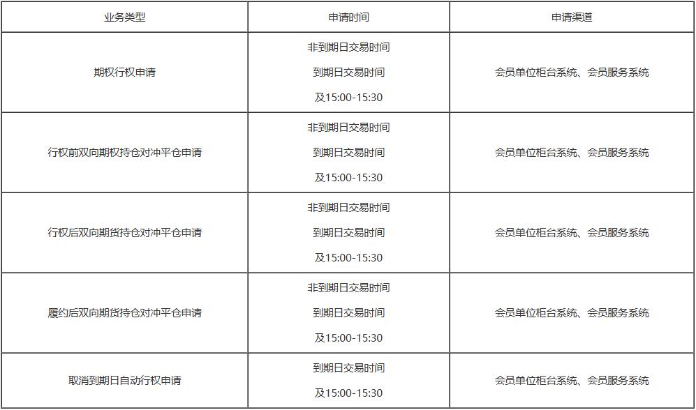 在每个交易日的交易时间以及到期日的15:00-15:30,客户可以提交“行权”、“行权前双向期权持仓对冲平仓”、“行权后双向期货持仓对冲平仓”和“履约后双向期货持仓对冲平仓”申请。