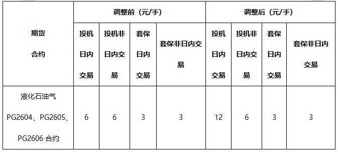 经研究决定,自2026年3月25日交易时(即3月24日夜盘交易小节时)起,对液化石油气期货品种合约手续费进行调整,具体如下: