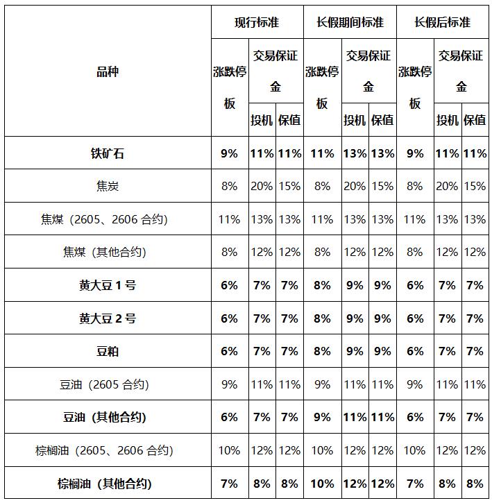 铁矿石、黄大豆1号、黄大豆2号、豆粕、豆油、棕榈油、玉米、玉米淀粉、鸡蛋、生猪、线型低密度聚乙烯、聚丙烯、聚氯乙烯、乙二醇、纯苯和苯乙烯品种期货合约涨跌停板幅度和交易保证金水平恢复至节前标准;线型低密度聚乙烯、聚丙烯和聚氯乙烯月均价期货合约的涨跌停板幅度和交易保证金水平与对应实物合约保持一致;其他品种期货合约涨跌停板幅度和交易保证金水平维持不变。