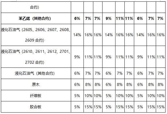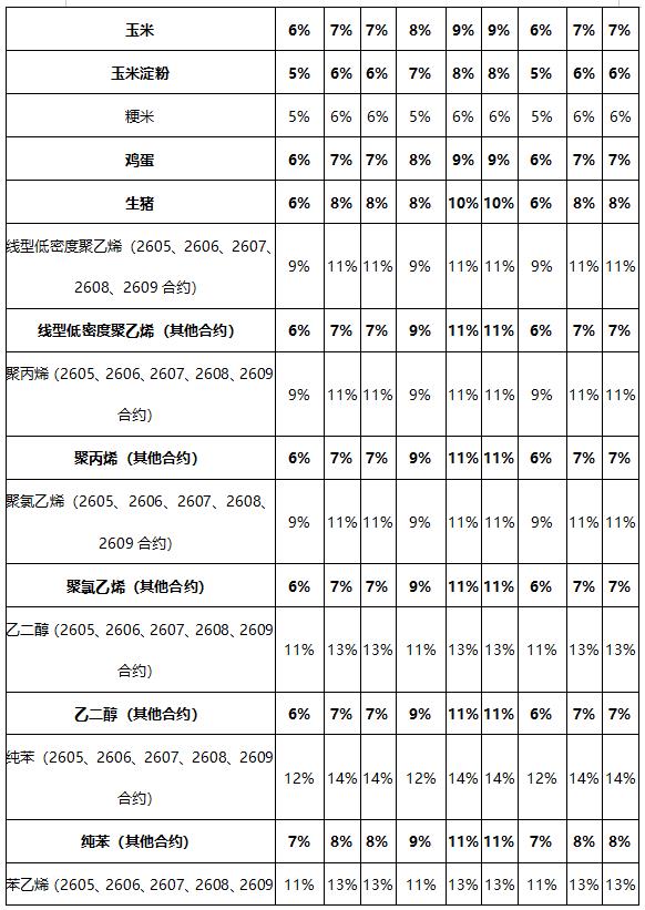 对同时满足《大连商品交易所风险管理办法》有关调整涨跌停板幅度和交易保证金规定的合约,其涨跌停板幅度和交易保证金按照规定数值中较大值执行。各品种2605合约进入交割月按照交割月交易保证金标准执行。